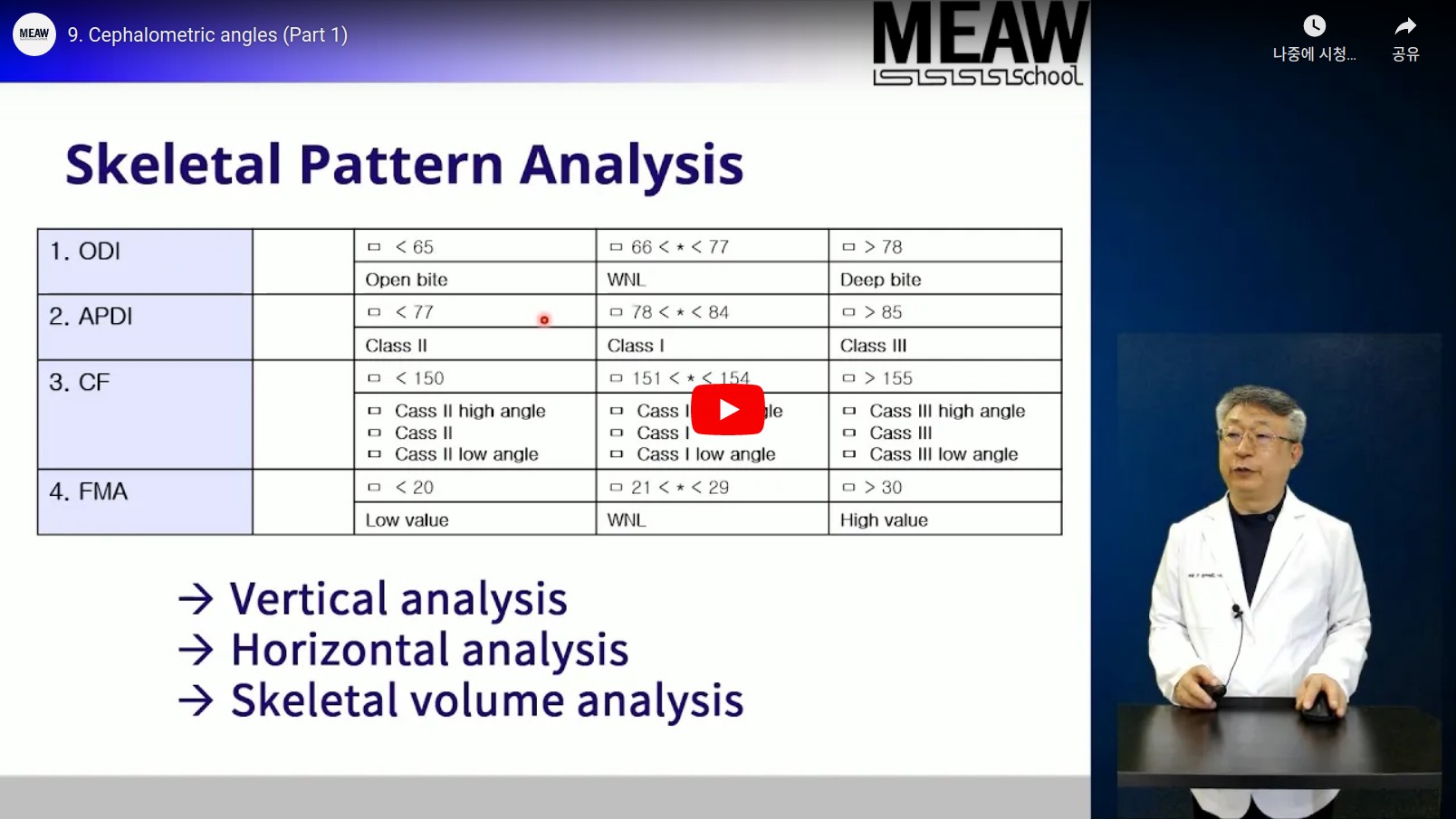 SpeakerDr. Jeong-il Kim LanguageKorean SubtitleEnglish Running Time 17:19 Price Free Sign Up 2 Facial plane angle facial angle AB to mandibular plane angle Palatal plane angle AB plane angle ODI APDI Combination factor CF Mandibular plane angle FMA