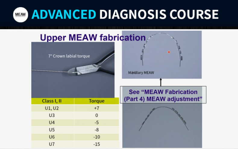 1) Anterior torque: crown labial torque2) Canine guidance3) Marking and loop position4) Upper MEAW fabrication